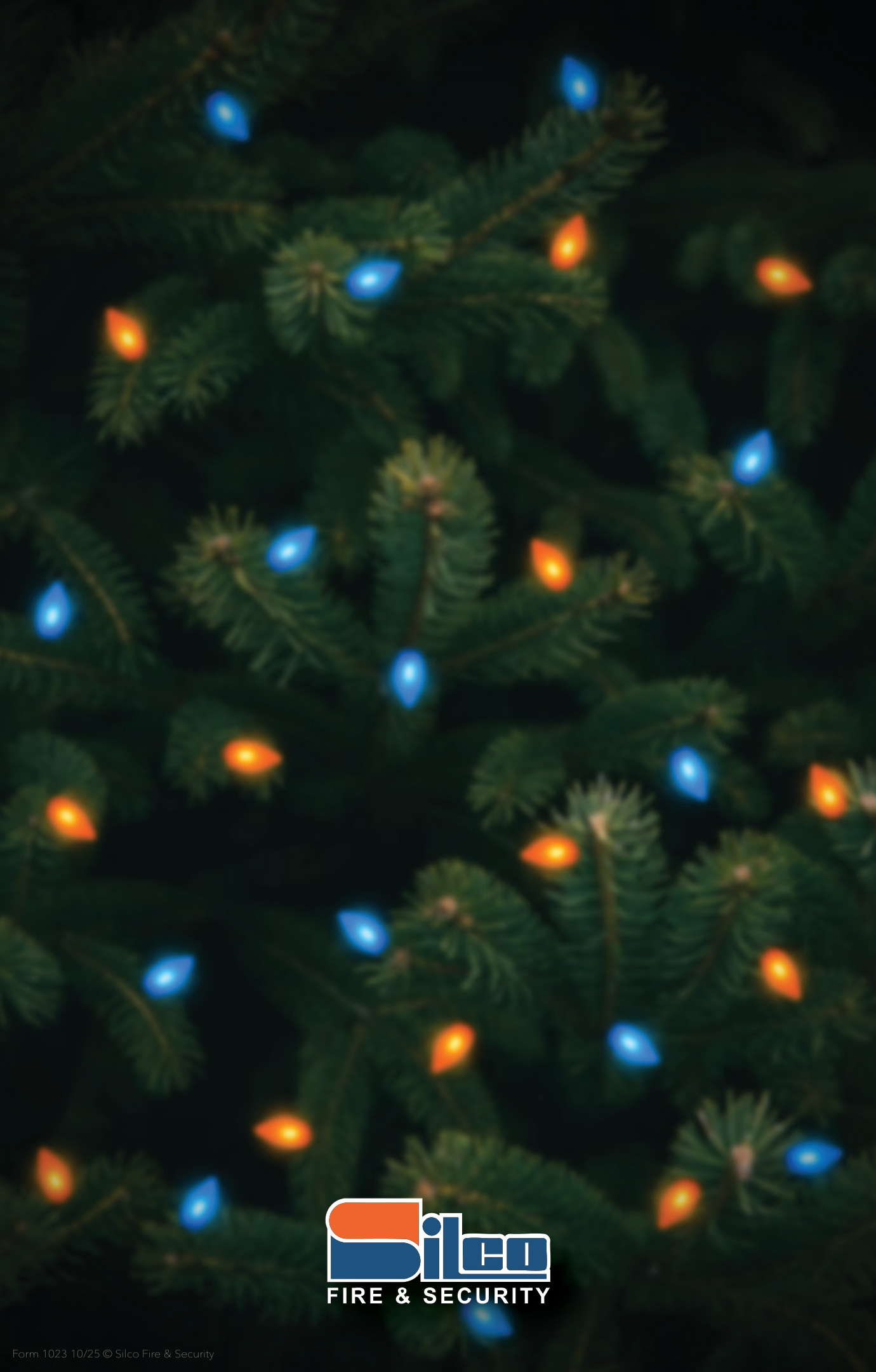 Back cover of a holiday greeting card from Silco Fire & Security featuring tree branches adorned with blue and orange colored Christmas lights, with a Silco Fire & Security logo featured at the bottom.
